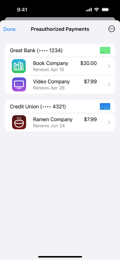 “钱包”中全新的“预授权付款”版块让你能够更清楚地了解通过 Apple Pay 授权的定期扣款。1 现在,用户可以更好地跟踪订阅、自动充值、分期贷款还款、定期账单和延期付款,以更深入地了解自己在财务方面的长期付款承诺。“预授权付款”还让用户能够更好地管理商家或发卡机构的定期扣款,他们可以根据需要在“钱包”中撤销付款授权。