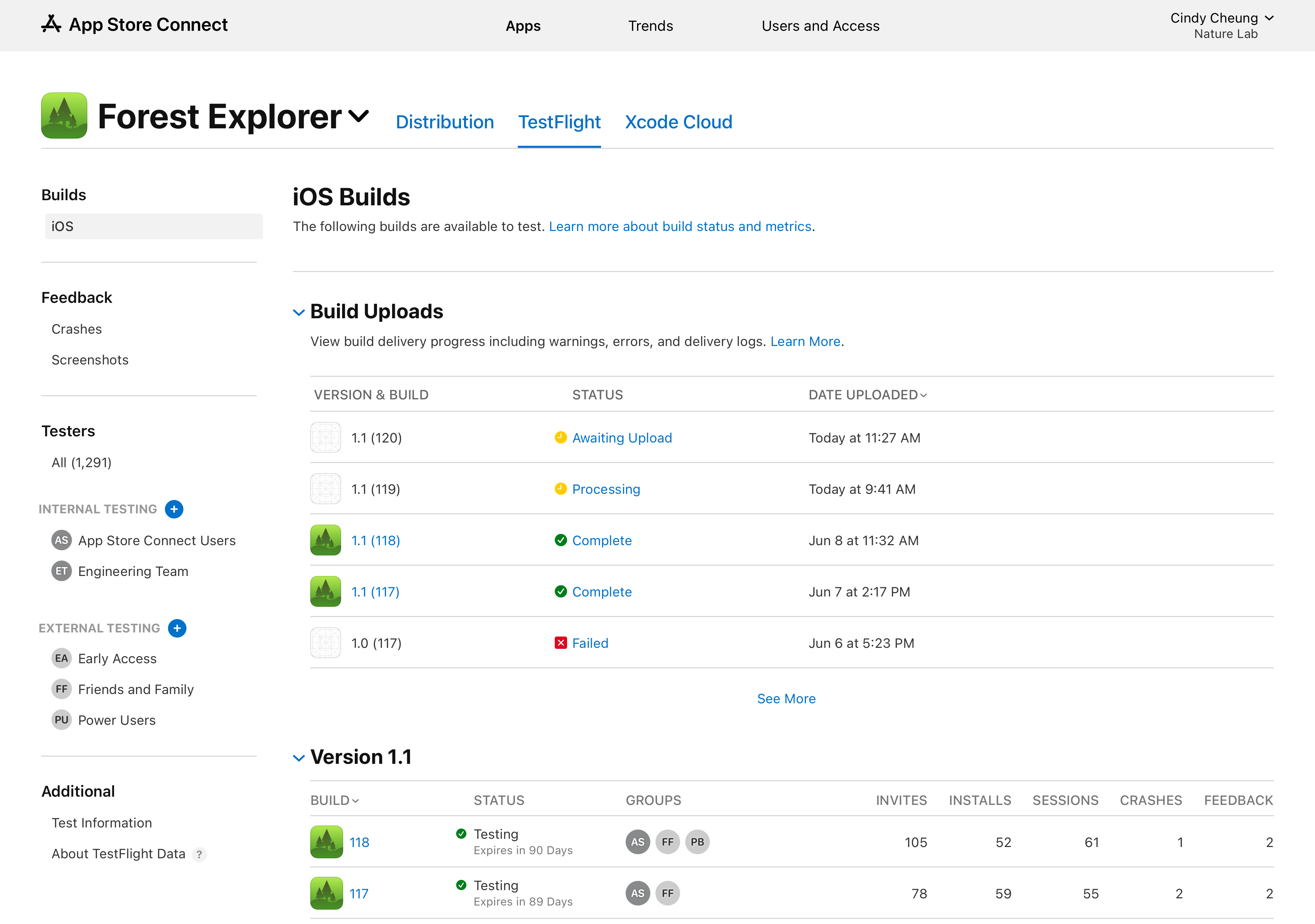 点按“TestFlight”标签页,即可查看所有构建版本。