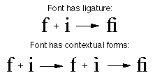 Ligatures are two or more glyphs combined to form a single new glyph, whereas contextual forms are variations on the shape of one glyph. The following figure shows how two fonts might form the "fi" ligature, the first using ligatures, the second using contextual forms. The first "fi" ligature is a single glyph that replaces the regular "f" and "i" glyphs. At the bottom of the following figure, the "i" glyph is changed into a contextual form before it is placed with the "f" glyph to form the "fi" ligature. In this second case, the "fi" ligature is not one stand-alone glyph, but two glyphs, after the "i" has been changed. If the "i" glyph had not followed the "f" glyph, the form would not have been changed.