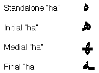 A contextual formis an alternate form of a glyph whose use depends on the glyph's placement in a word. In Arabic, for example, characters have different contextual forms according to where they appear (at the beginning, the middle, or the end of a word). The following figure shows the forms of the Arabic letter "ha" that appear alone, at the start, middle, or end in a word. The same character code is used for each case. The information that you provide in the font tables allows the correct glyph to be chosen.