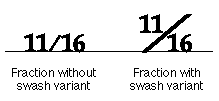 By using the contextual form and swash capabilities, you can provide for the automatic construction of fractions. Because a fraction slash character code is defined in the Macintosh set (code 0xDA), you can set up a font table that, for example, recognizes strings of the type "digits, fraction slash, digits." You can then make several choices, depending on the glyph repertoire -- for example, a "one-half" glyph may be predrawn and in the font. If there is no predrawn form, then you can substitute smaller superscript and subscript digit glyphs, or you can set up a cross-stream kerning table to shift digits relative to the baseline automatically. An example is given in the following figure: