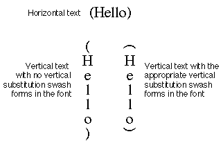 Vertical substitutionis a swash variation in which a glyph is replaced by an alternate form in a vertical line. (Note that this substitute glyph is not merely the first glyph rotated but is a stand-alone glyph.) For vertical substitution to work, the vertically rotated forms must exist in the font and must be indicated as such in the font's tables; otherwise, no glyphs are substituted. Default behavior is to perform any such substitutions permitted by the font. The following figure shows how this works: