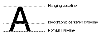 When you design your font, you can add definitions of its default baseline and the relative positions of other types of baselines within the font's em- square. The following figure shows a glyph from a font whose primary baseline is the Roman baseline. However, two other baselines are also marked: the hanging baseline and the ideographic centered baseline. If you used this font with text whose dominant baseline was, for instance, the hanging baseline, this font would align itself with the dominant run of text by aligning its hanging baseline with that of the dominant run.