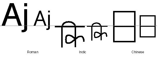 There can be dramatic differences in the general relationships of glyphs with reference to the baseline. The following figure shows three scripts and the relation of different sizes of glyphs to the dominant baseline in each script: