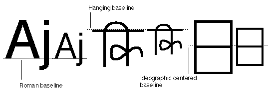 This also defines behavior used in Chinese, Japanese, and Korean, but with the glyphs lowered slightly so that ideographs adjacent to Roman characters descend slightly below the Roman baseline.