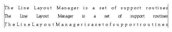 The following figure demonstrates how AAT allows you to adjust the priorities of the inter-character and inter-word spacings to achieve justification control. The first line of text has the default settings for interglyph and interword spacing. The second line of text has all justification effects assigned to interword spacing. The last line of text has all justification effects assigned to interglyph spacing.