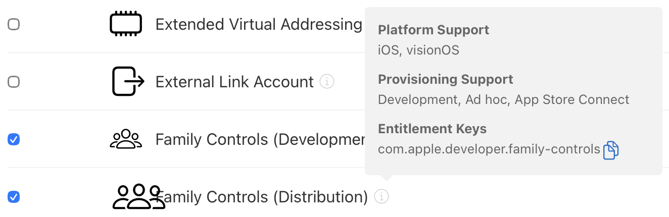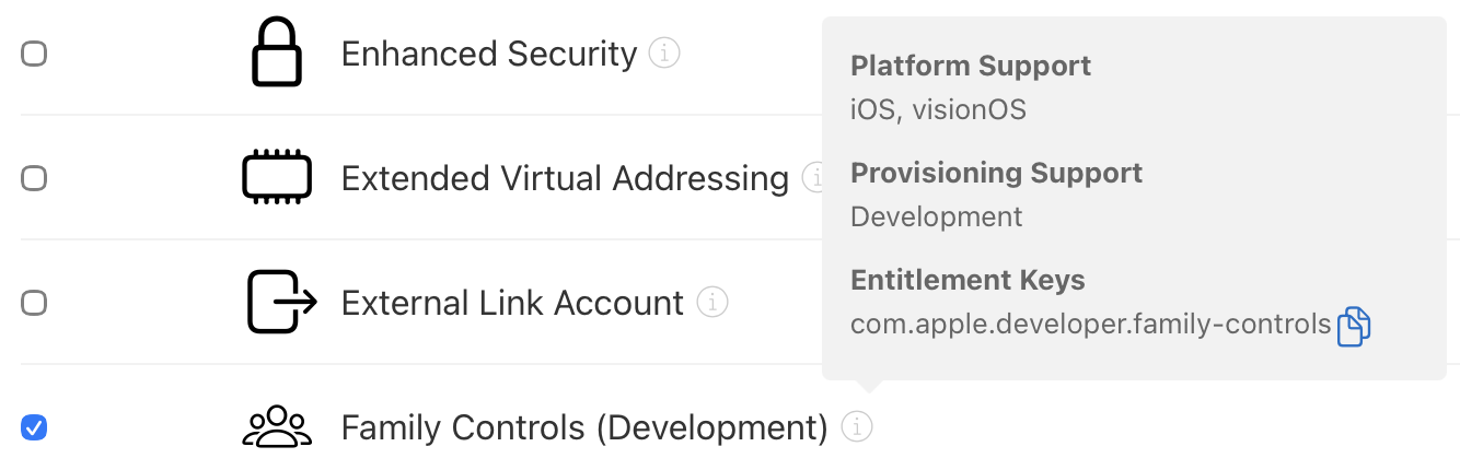 For example, the following shows that the standard Family Controls (Development) capability, which authorises use of the com.apple.developer.family-controls entitlement, is only enabled for development on iOS and visionOS.