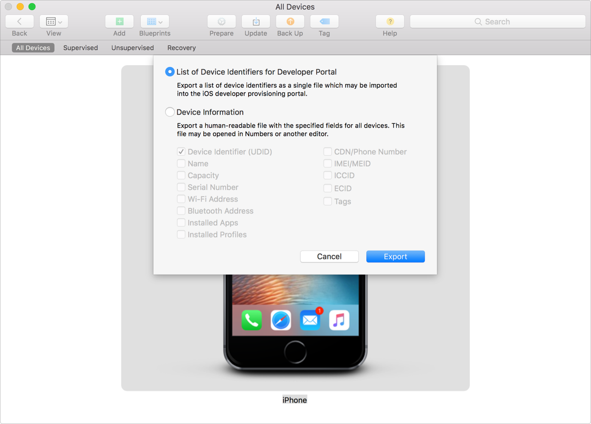 1. In Apple Configurator 2, choose Actions > Export > Info.