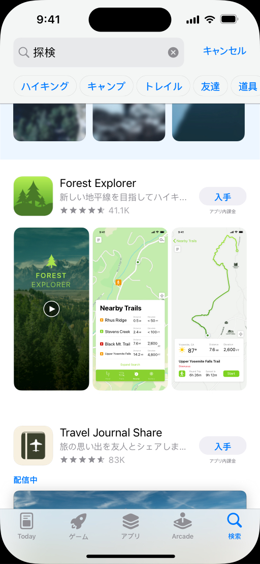 アプリ内課金は検索結果にも表示され、「Today」、「ゲーム」、「アプリ」の各タブに表示される可能性があります。ユーザーがこれらの場所でアプリ内課金アイテムをタップすると、プロダクトページに移動し、アプリの説明、スクリーンショット、アプリプレビューを見たり、そのアプリ内課金を購入したりすることができます。アプリ本体をデバイスにインストールしていないユーザーがアプリ内課金コンテンツを購入する場合、トランザクションを完了する前にアプリをダウンロードまたは購入するよう促されます。