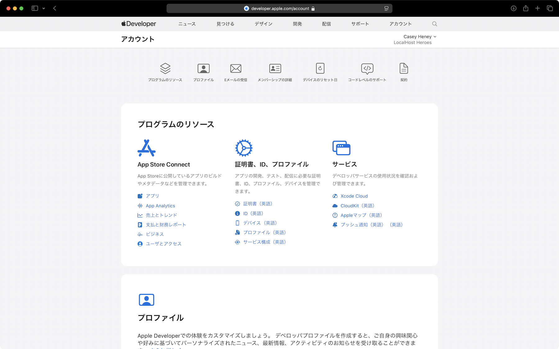 主要なデベロッパリソースにアクセスするには、Apple Developer WebサイトでApple Accountにサインインします。有料プログラム(Apple Developer ProgramまたはApple Developer Enterprise Program)に登録済みの場合は、登録時に使用したApple Accountをご使用ください。