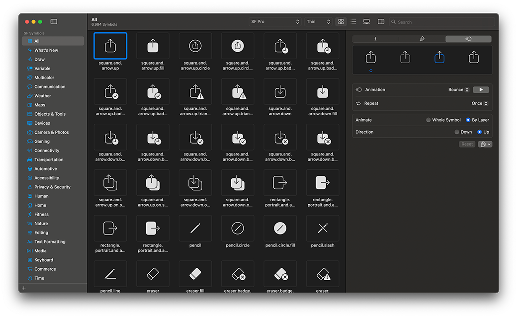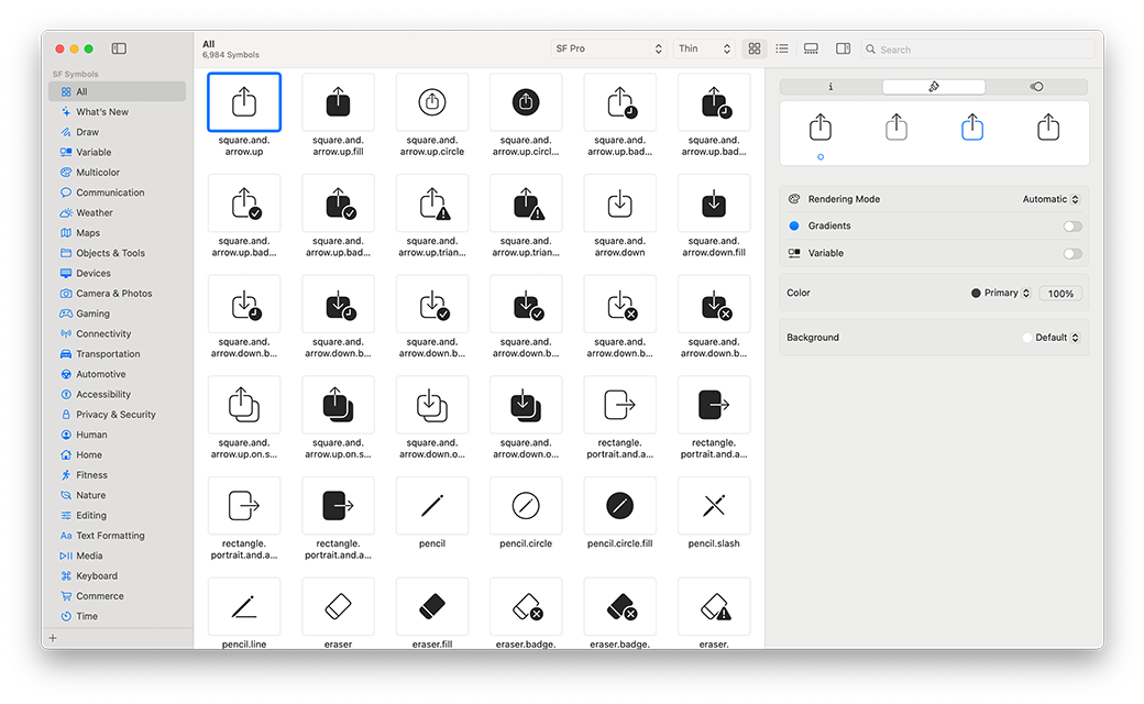SF Symbols 7은 Apple 플랫폼의 시스템 서체인 San Francisco와 매끄럽게 통합되도록 설계된 6,900개 기호의 라이브러리입니다. 기호는 9개의 굵기와 3개의 크기로 제공되고, 자동으로 텍스트에 따라 정렬되며, 벡터 그래픽 도구로 내보내고 편집해 디자인 특징과 손쉬운 사용 기능을 공유하는 맞춤형 기호를 생성할 수 있습니다. SF Symbols 7은 그리기 애니메이션과 가변 렌더링, 향상된 매직 대치, 그레이디언트 및 수백 개의 새로운 기호를 도입했습니다.