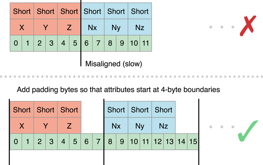 In Figure 8-4, the position and normal data are each defined as three short integers, for a total of six bytes. The normal data begins at offset 6, which is a multiple of the native size (2 bytes), but is not a multiple of 4 bytes. If this vertex data were submitted to iOS, iOS would have to take additional time to copy and align the data before passing it to the hardware. To fix this, explicitly add two bytes of padding after each attribute.