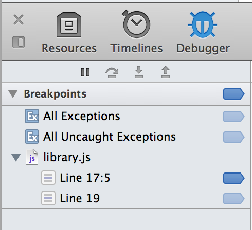 Every breakpoint you set across all your scripts appears under Breakpoints in the navigation sidebar, as shown in Figure 4-2. Clicking the line jumps the text in the content browser to the line with the breakpoint. The breakpoint icon to the right of the line number allows you to enable and disable the breakpoint without removing it.