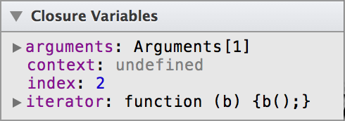 If you set a breakpoint within a closure, or anonymous function, you see variables appear in the Closure Variables section, as shown in Figure 4-9. Closures have privileged access to the scope of the outer function that calls them.