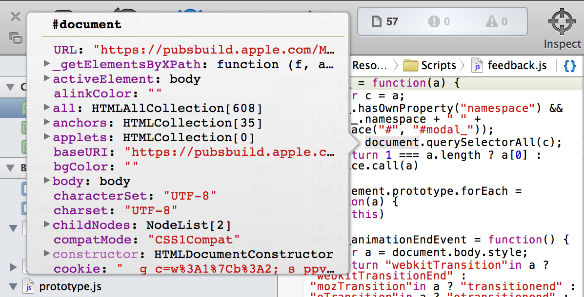 After one or more breakpoints are set, reload your page. Breakpoints retain their position across page loads, so your breakpoints won’t be lost. As soon as Safari’s JavaScript interpreter reaches a line of code that has a breakpoint on it, JavaScript execution halts, and the Scope Chain details sidebar appears. The Scope Chain contains a snapshot of variables available to the scope of the paused line, as well as their current values. For further information about the Scope Chain details sidebar, continue to Scope Chain.