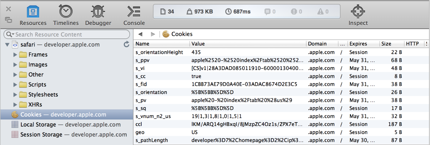 Entries in this table are read-only; if you want to edit a cookie’s value, you need to do so with the document.cookie object in JavaScript (you can use the Quick Console at the bottom of the content browser to modify the cookie and see the results update in real time). Pressing the Delete key while a cookie is selected deletes the cookie.
