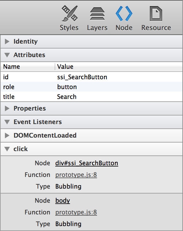 The Event Listeners section lists all JavaScript events attached to this node and its ancestors. It presents the type of event, such as click or mouseover, as well as the name of the function it calls. If your JavaScript events aren’t firing as expected, check here to confirm that the element is indeed listening for the intended event and function.