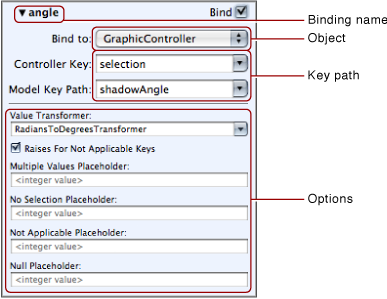 You can establish bindings easily in Interface Builder using the Bindings pane of the Info window. In Interface Builder, the angle binding for a joystick that displays the offset and angle of graphics object’s shadow might look like Figure 6.