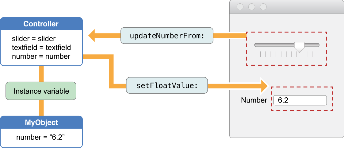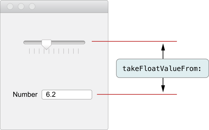 Note that this implementation does not use the target-action pattern. The slider does not send an action message to the controller. Instead, as the slider moves, it informs the controller directly that the value of its content’s number has changed and what the value is. The controller updates the model and in turn informs the text field and slider that the value they are displaying has changed. (In examples as simple as this controllers are not really necessary, however in most cases they are.) The mechanisms used to relay information are explained later in this article and in greater detail in How Do Bindings Work?, but it is important to appreciate that in most cases you will not have to write any glue code.
