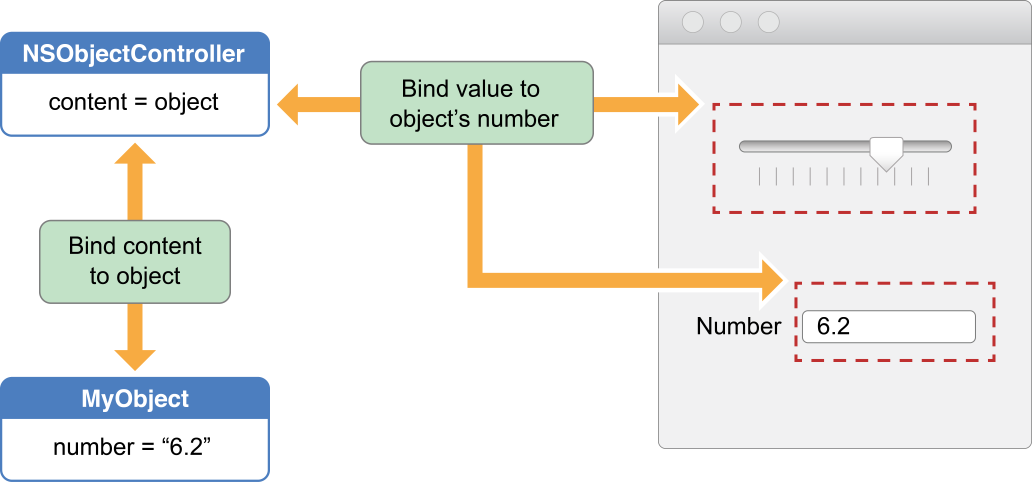 Cocoa bindings uses prebuilt controller objects (subclasses of NSController) and supporting technologies to keep values synchronized automatically. The application design for an implementation of the slider example that uses bindings is shown in Figure 4.