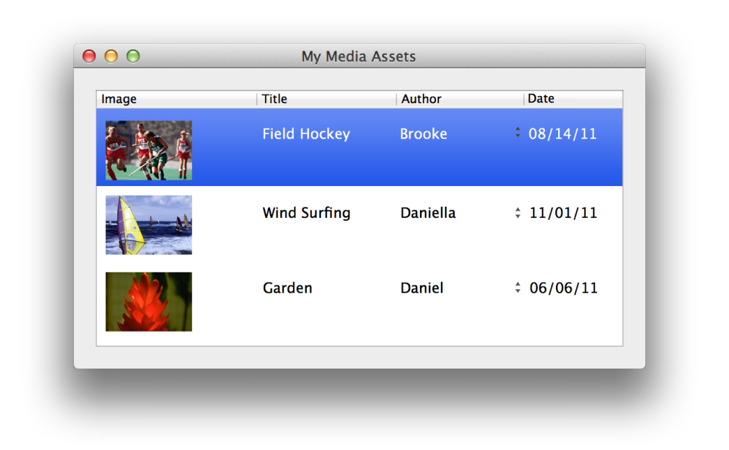 The example presented in this article is an extension of those in Creating a Master-Detail Interface. Specifically, this article explains how to add an NSImageCell to a table column in the master interface (shown in Figure 1) and an NSImageView to the detail interface. This article also contains an example of a custom value transformer that converts image filenames to absolute paths.