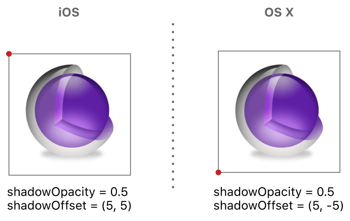 The opacity value for layer shadows is set to 0 by default, which effectively hides the shadow. Changing the opacity to a nonzero value causes Core Animation to draw the shadow. Because shadows are positioned directly under the layer by default, you might also need to change the shadow’s offset before you can see it. It is important to remember, though, that the offsets you specify for the shadow are applied using the layer’s native coordinate system, which is different on iOS and OS X. Figure 2-5 shows a layer with a shadow that extends down and to the right of the layer. In iOS, this requires specifying a positive value for the y axis but in OS X the value needs to be negative.