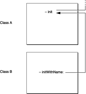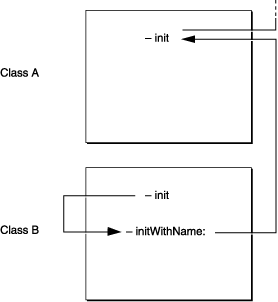 A class must also make sure that all inherited initialization methods work. For example, if class A defines an init method and its subclass B defines an initWithName: method, as shown in Figure 2-1, B must also make sure that an init message successfully initializes B instances. The easiest way to do that is to replace the inherited init method with a version that invokes initWithName::