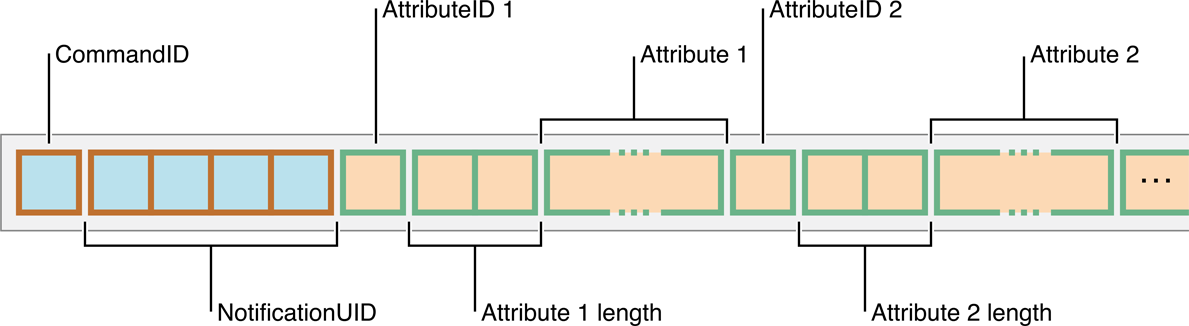 AttributeList: A list of AttributeIDs/16-bit Length/Attribute tuples. An attribute is always a string whose length in bytes is provided in the tuple but that is not NULL-terminated. If a requested attribute is empty or missing for the iOS notification, its length is set to
