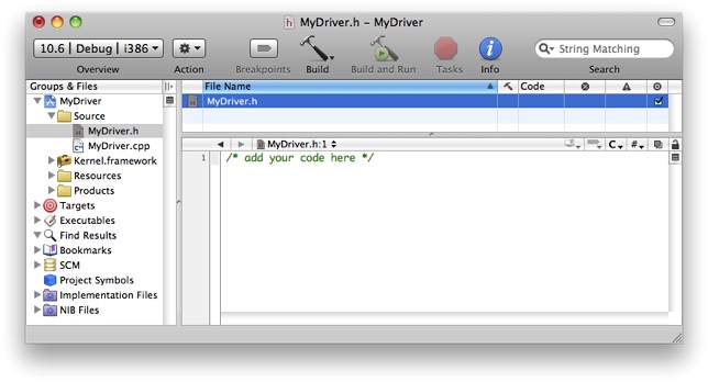 IOLogfunction is the kernel equivalent ofprintffor an I/O Kit driver.Save your changes by choosing File > Save.