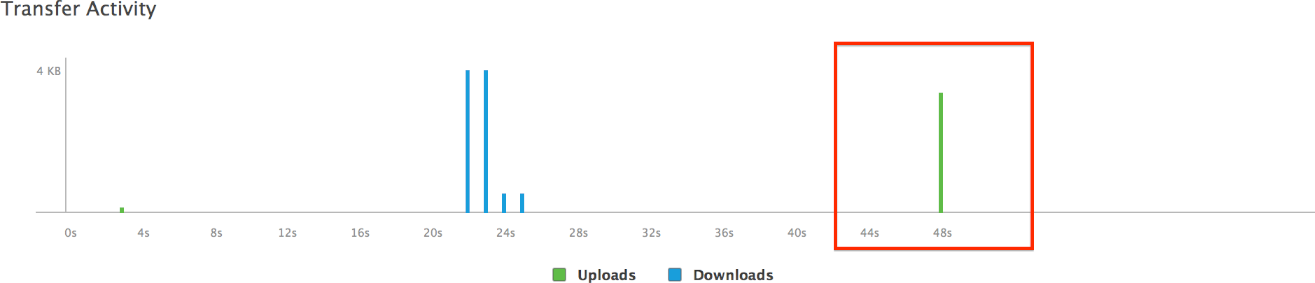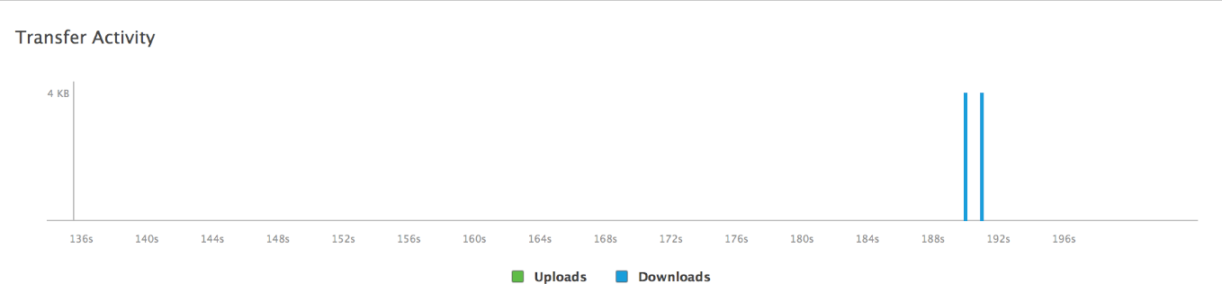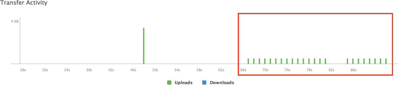 The iCloud Report displays the bandwidth usage of iCloud over time for your app. Green bars indicate that transaction logs or other miscellaneous requests have been sent from the currently attached peer to iCloud, and blue bars indicate that transactions logs and requests have been received from iCloud. You use the Transfer Activity timeline to:
