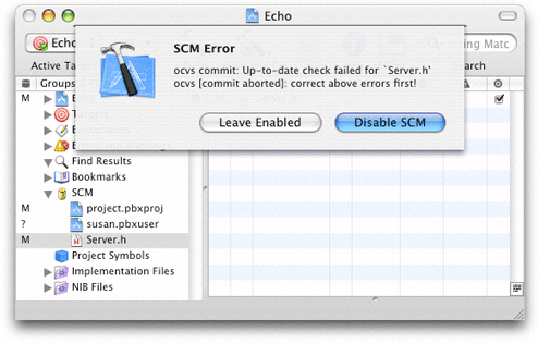 If your client tool encounters a problem during the commit process (for example, a file to be processed is outdated), Xcode displays a dialog showing your client’s error message, as shown in Figure 22-15.