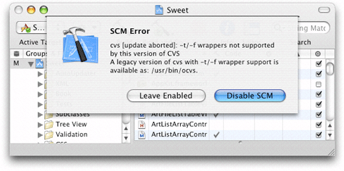 If Xcode is unable to talk to your client, a dialog describing the problem appears. In it you may choose to disable SCM or to leave it enabled. For example, if you try to access a project that contains wrapped bundles with a version of CVS that doesn’t support wrappers, the dialog shown in Figure 21-4 appears.