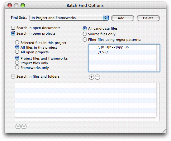 The Batch Find Options window lets you modify Xcode’s default sets of search options, or define your own sets. This is particularly useful if you find yourself searching the same set of files over and over again. Instead of configuring the set of files to search each time, simply configure it once and save it as a search option set. To reuse the search option set, simply select it from the pop-up menu next to the Find button in the Project Find window.