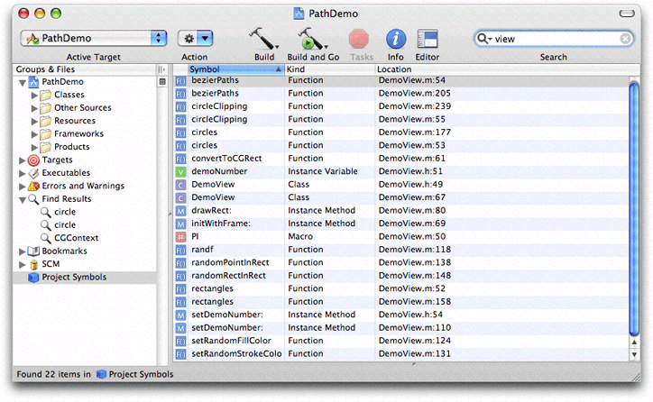 To sort the symbols listed in the project window according to any of these categories, simply click the appropriate category heading. In addition, you can use the Search field in the project window toolbar to narrow the list of symbols to those matching a string or keyword. You can search the contents of any one of the categories—symbol name, symbol kind, or location—or you can search them all. In the PathDemo project, for example, you can search for all symbols declared in files pertaining to views by selecting “Search By Location” from the pop-up menu in the search field and typing “view.” The symbols listed in the detail view are narrowed to include only those symbols defined in files whose names contain the word “view,” as shown in the following figure. By default, the search field searches the content of all categories in the detail view.