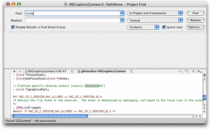 This section describes how to use Xcode’s project-wide search features to search through multiple files in your project and its included frameworks for text, regular expressions, and symbol definitions. This section also describes how to view search results. The single-file find is discussed further in Searching in a Single File. In addition, shortcuts for performing searches from an Xcode editor window are described in Shortcuts for Finding Text and Symbol Definitions From an Editor Window.