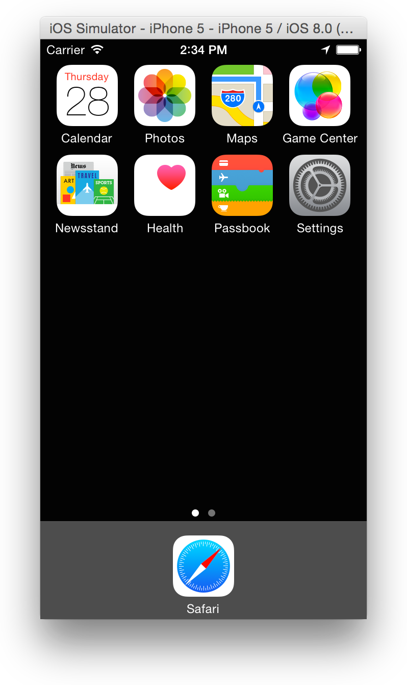 Much like the Home screen on an iOS device, the simulator’s iOS Home screen has multiple pages. After clicking the Home button (or accessing the Home screen through the Hardware menu), you arrive at the second page of the Home screen. To get to the first page, where all of the preinstalled apps are found, swipe to the first Home screen by dragging to the right on the simulator screen.