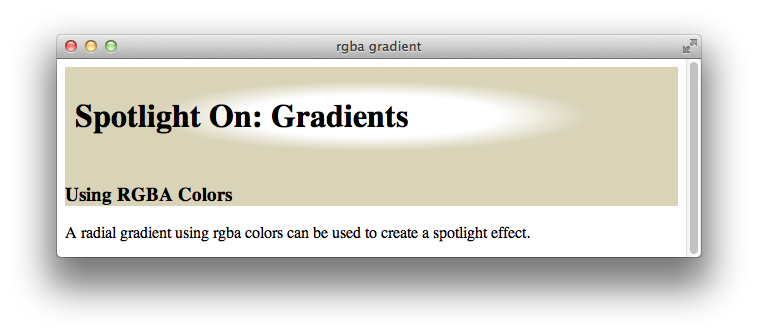 If you use RGBa colors in your color stops, you can specify both the hue and transparency of the gradient at any point. This enables you to create a gradient that blends into the background of its parent element. For example, Listing 1-2 creates a spotlight effect by fading a div element’s background from white to transparent, allowing the parent div’s background to gradually show through. Figure 1-14 shows the result: