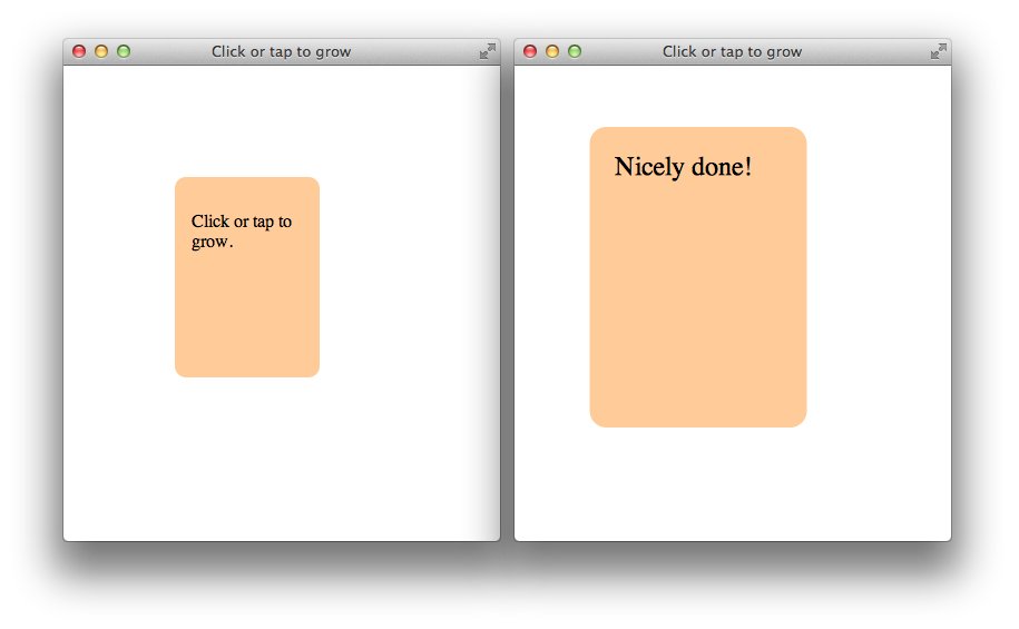 In this first example, the user can click an element using the mouse or tap an element using a finger to change the element’s size. The change in size is a 2D CSS transform animated using a CSS transition. A finger tap triggers an onclick event in Safari on iOS, so an event handler for onclick events is all you need to handle both tap and click events.