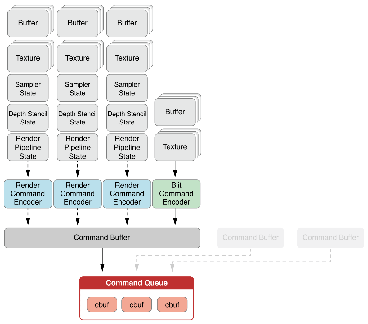 Figure 2-1 shows how the command queue, command buffer, and command encoder objects are closely related. Each column of components at the top of the diagram (buffer, texture, sampler, depth and stencil state, pipeline state) represent resources and state that are specific to a particular command encoder.