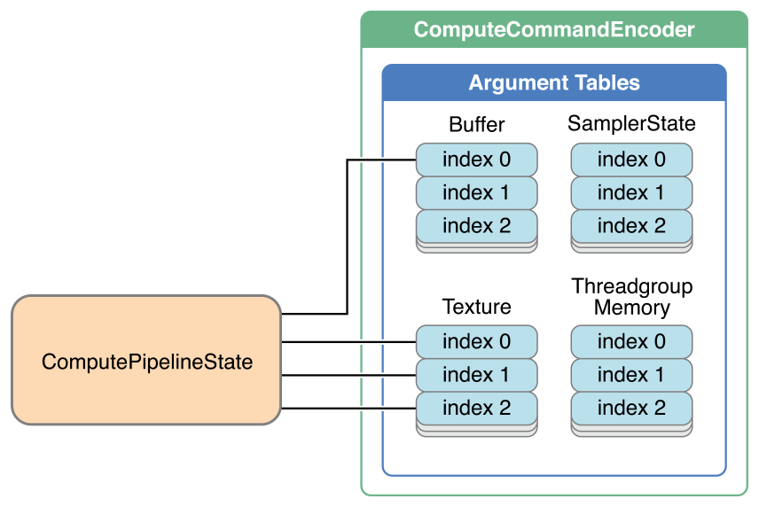 The following MTLComputeCommandEncoder methods specify a resource (that is, a buffer, texture, sampler state, or threadgroup memory) that is used as an argument to the compute function represented by the MTLComputePipelineState object.