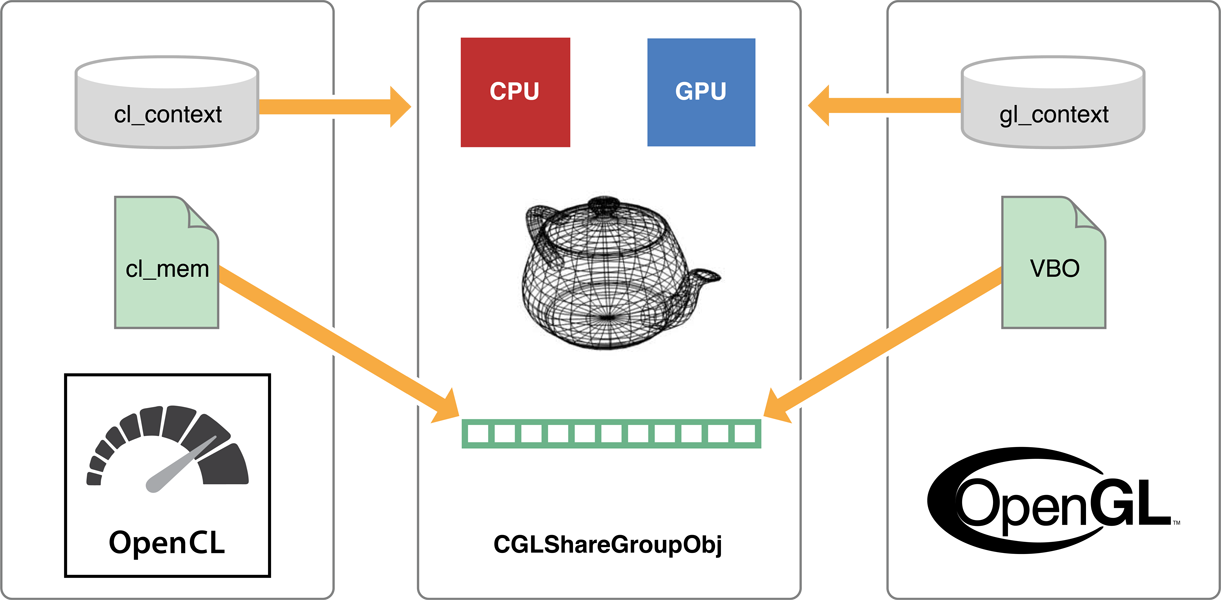 Figure 10-1 illustrates a typical scenario in which OpenCL generates geometry on the GPU and OpenGL renders the shared geometry, also on the GPU. They may see what they are looking at as different objects - in this case, OpenGL sees the data as a VBO and OpenCL sees it as a cl_mem. The result is that both the OpenCL and OpenGL contexts end up referencing the same sharegroup (CGLShareGroupObj) object, see the same devices, and access this shared geometry.