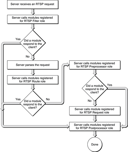 QTSS_RTSPFilter_Role,QTSS_RTSPRoute_Role,QTSS_RTSPAuthenticate_Role,QTSS_RTSPAuthorize_Role,QTSS_RTSPPreProcessor_Role,QTSS_RTSPRequest_Role,QTSS_RTSPPostProcessor_Role, andQTSS_RTSPSessionClosingRole. The RTSP session also calls modules in theirQTSS_RTSPIncomingData_Role. The RTP session handles the following role calls as well as data reads and writes:QTSS_RTPSendPackets_Role,QTSS_RTCPProcess_Role, andQTSS_ClientSessionClosing_Role. For more information about roles, see Module Roles.