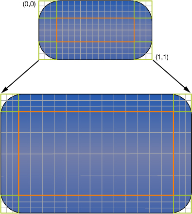 You can designate a portion of a view as stretchable so that when the size of the view changes only the content in the stretchable portion is affected. You typically use stretchable areas for buttons or other views where part of the view defines a repeatable pattern. The stretchable area you specify can allow for stretching along one or both axes of the view. Of course, when stretching a view along two axes, the edges of the view must also define a repeatable pattern to avoid any distortion. Figure 1-3 shows how this distortion manifests itself in a view. The color from each of the view’s original pixels is replicated to fill the corresponding area in the larger view.