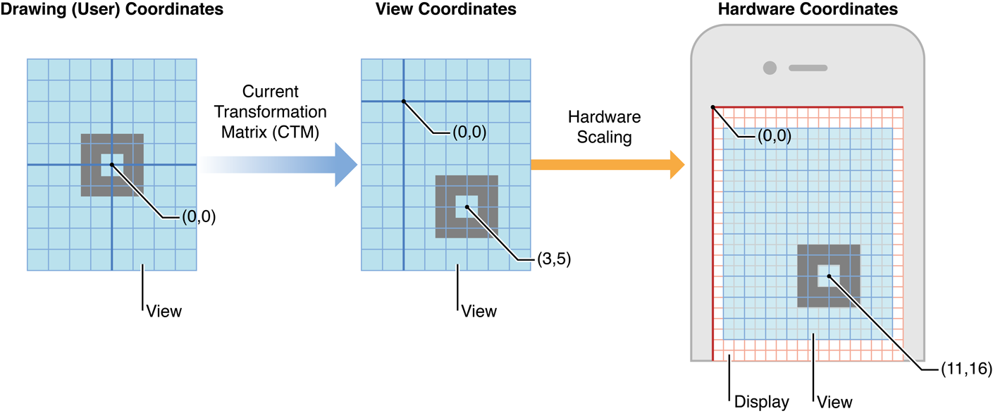 The drawing frameworks of iOS create graphics contexts for drawing to specific destinations—the screen, bitmaps, PDF content, and so on—and these graphics contexts establish the initial drawing coordinate system for that destination. This initial drawing coordinate system is known as the default coordinate system, and is a 1:1 mapping onto the view’s underlying coordinate system.