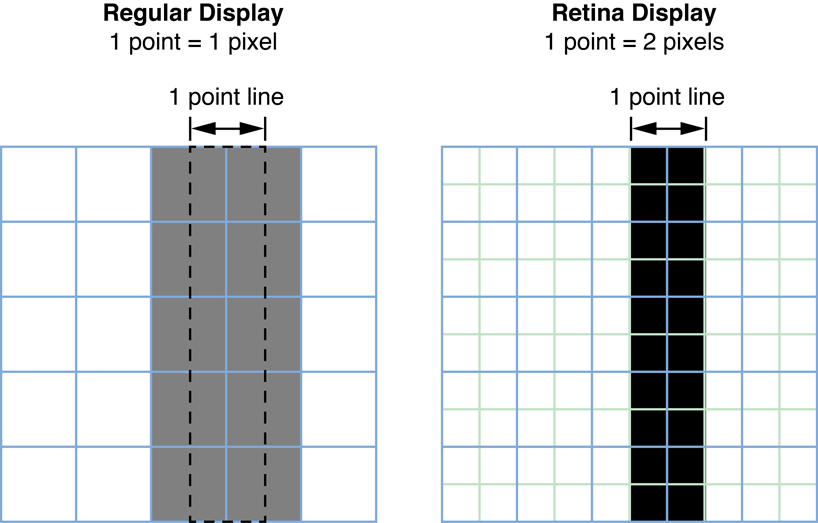 Because of this automatic mapping, when writing drawing code, pixels usually don’t matter. However, there are times when you might need to change your app’s drawing behavior depending on how points are mapped to pixels—to download higher-resolution images on devices with high-resolution screens or to avoid scaling artifacts when drawing on a low-resolution screen, for example.