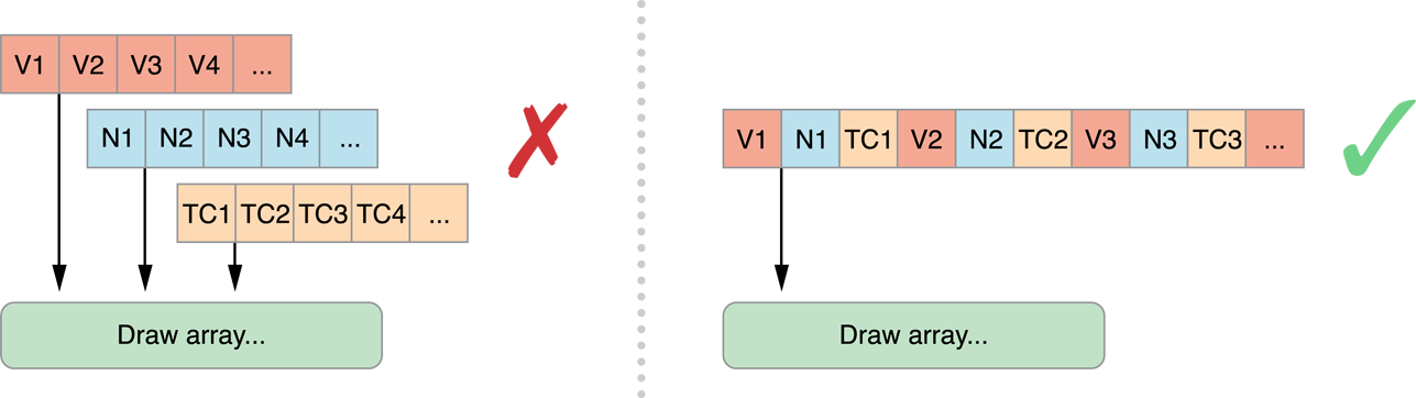 You can specify vertex data as a series of arrays (also known as a struct of arrays) or as an array where each element includes multiple attributes (an array of structs). The preferred format on iOS is an array of structs with a single interleaved vertex format. Interleaved data provides better memory locality for each vertex.