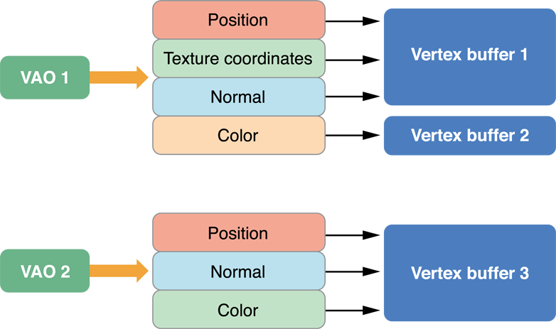 Figure 8-7 shows an example configuration with two vertex array objects. Each configuration is independent of the other; each vertex array object can reference a different set of vertex attributes, which can be stored in the same vertex buffer object or split across several vertex buffer objects.