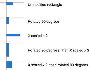 Most combinations of rotation, translation, and scale behave as you would intuitively expect them to, if you consider what each transform does and perform the operations in a logical sequence. The one exception is combining rotation and asymmetric scaling—not just making things bigger or smaller, but stretching or compressing the shape by using a different scale on the x-axis and y-axis.