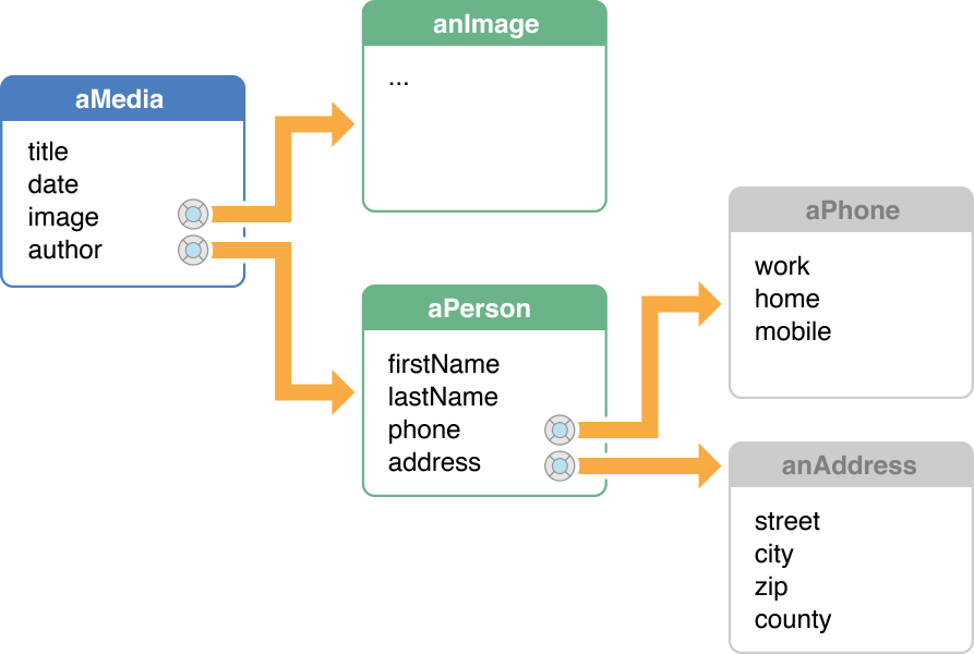 For example, Figure 2 illustrates the object diagram of the models in a media asset application. In this example, assume the application uses a document-based architecture in which MyDocument (the File’s Owner of the MyDocument.nib file) has a mediaAssets instance variable that is initialized to an array of Media objects.