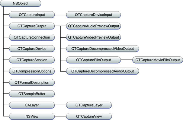 Figure 2-1 illustrates the class hierarchy for the classes that comprise the portion of the QTKit API dedicated to audio and video capture. The ordering and logical structure of this hierarchy are discussed in the next section.